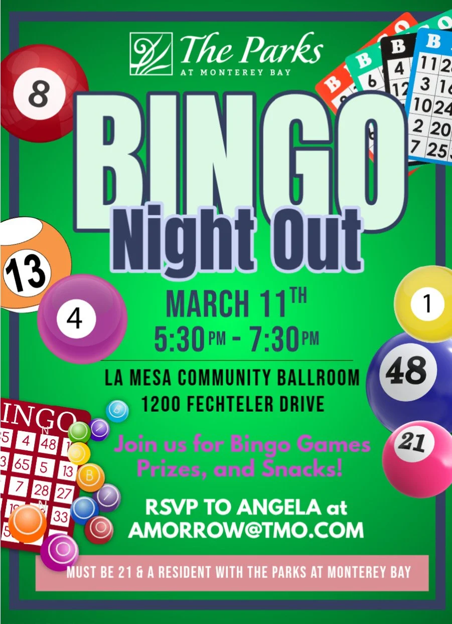 Bingo Wednesday, March 11, 2026 5:30 PM 7:30 PM 17:30 19:30 1200 Fechteler Drive Monterey, CA 93940 United States (map) Google Calendar ICS